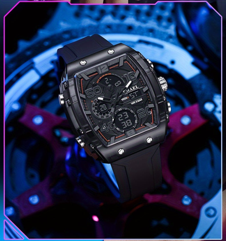 Embrace the bold, trendy streetwear look with this SMAEL digital sports watch. Its unique barrel-shaped case and vibrant accents make it the perfect accessory for a modern, active lifestyle.